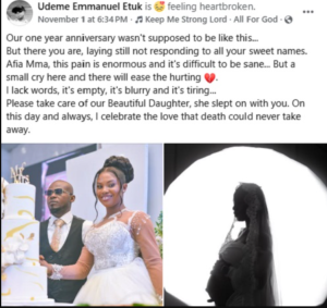 Sharing the sad news on Facebook, her husband, Udeme Etuk Emmanuel wrote: