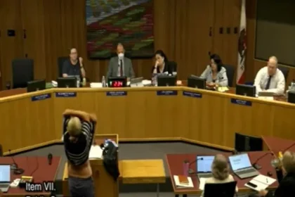 Shocking moment mum strips during school board meeting to protest transgender students using girls’ changing rooms (video)