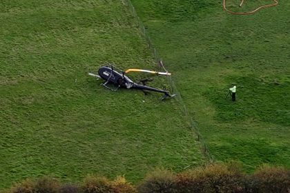 A helicopter has crashed on a field just yards from factories in…