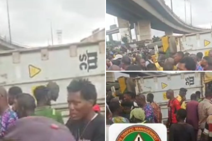 Police officer and woman k!lled as 40-ft container falls on tricycle in Lagos