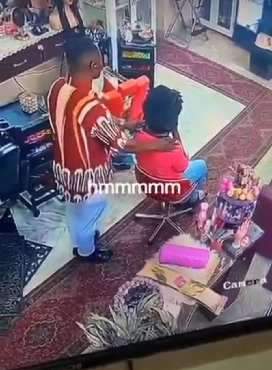 The incident, which reportedly occurred inside a hair salon, was captured by the establishment’s security camera.