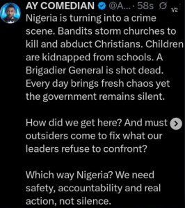 Nigerian comedian AY Makun has spoken out about the growing insecurity in the country, describing Nigeria as “a crime scene” and criticizing the government for its apparent inaction.