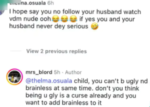 “@thelma.osuala, child, you can’t be ugly and brainless at the same time. Don’t you think being ugly is a curse already, and you want to add brainless to it?”