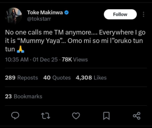 She wrote, “No one calls me TM anymore… Everywhere I go it is ‘Mummy Yaya’… Omo mi so mi l’oruko tun‑tun,” expressing joy over the new affectionate title.