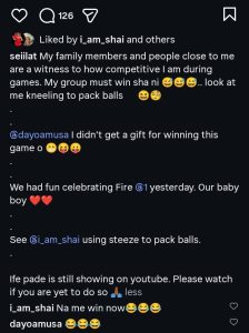 “My family members and people close to me are witnesses to how competitive I am during games. My group must win sha ni.