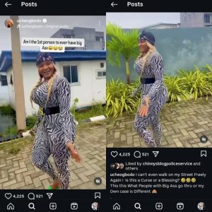 The controversial actress, via her Instagram page, revealed that since she went under the knife to increase her backside, she can’t walk freely on the street again. She questioned if she was the first to ever have a big behind.