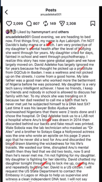 In a lengthy statement posted online, Labinjoh began by clearly distancing herself from claims surrounding Davido, saying: “First things first, my name is Ayo Labinjoh. I’m NOT Davido’s baby mama or a b!tch.” She explained that her decision to speak up was driven by the emotional toll the situation has taken on her daughter.
