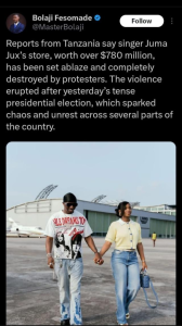 A Twitter user identified as Bolaji Fesomade had alleged that the singer’s store, reportedly valued at over ₦780 million, was completely destroyed in a fire during violent protests that followed Tanzania’s tense presidential election.