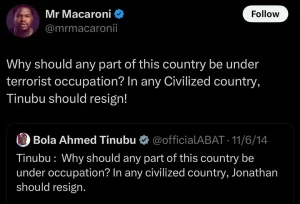 “This is a very useless and irresponsible government feasting on the blood of innocent Nigerians! As in I don’t understand, school children have been kidnapped, a general killed, and everything is fine??? Why should any part of this country be occupied by terrorists? In any civilized country, Tinubu should resign!”