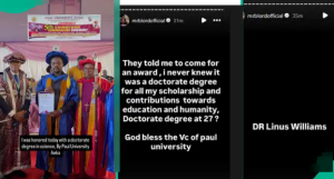 “They told me to come for an award, I never knew it was a doctorate degree for all my scholarship and contributions towards education and humanity, doctorate degree at 27? God bless the VC of Paul University,” Blord wrote.