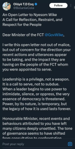 Human rights advocate, Oloye T.D, Esq., has addressed an open letter to the Minister of the Federal Capital Territory (FCT), Nyesom Wike, following his recent altercation with a naval officer, A.M. Yarima.