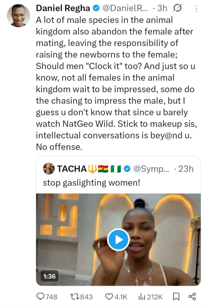Regha, however, pointed out that some animals mate and then abandon the females and their offspring. He concluded by advising Tacha to focus on her makeup content instead of engaging in such intellectual debates.