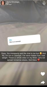 “Oops. You mistakenly sent the chat to me Hun. And no, I’m not on Ozempic. I’ve never hidden how I lost weight. There’s a whole video on my TikTok. Let’s not spread the nonsense please. God bless”.