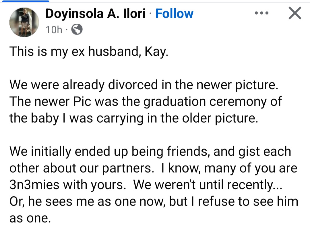 “We initially ended up being friends, and gist each other about our partners. I know, many of you are 3n3mies with yours. We weren’t until recently… Or, he sees me as one now, but I refuse to see him as one.