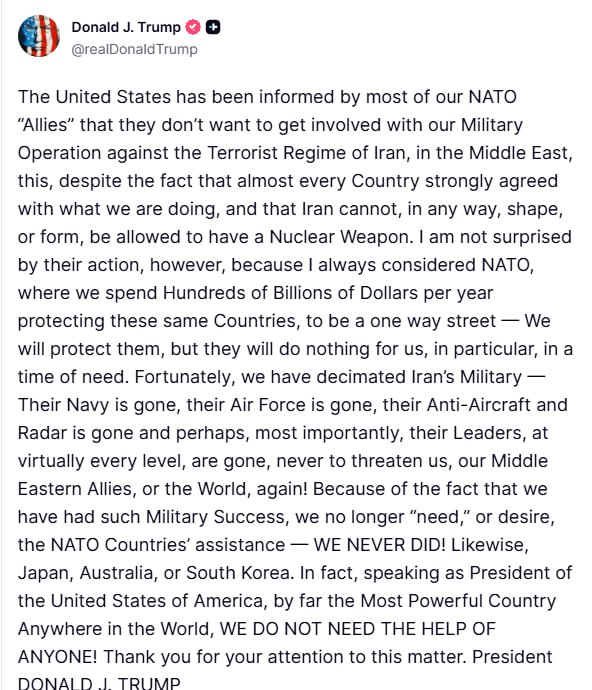 “We don’t need too much help. We don’t need any help,” he said, adding in a separate social media post that the U.S. had achieved enough military success to no longer require NATO’s involvement.