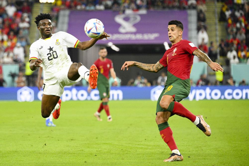 Joao Cancelo (POR) vs Kudus Mohammed (GHA) during the FIFA World Cup match Ghana v Portugal on November 24, 2022 in Doha, Qatr. (Photo by JB Autissier/Panoramic/Icon Sportswire) ****NO AGENTS---NORTH AND SOUTH AMERICA SALES ONLY****